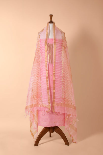 This Handwoven Pink Chanderi Suit piece is an elegant piece with a contemporary take on colours. The intricate gold detailing makes it perfect for any daytime occasion or festival. Handwoven in Banaras, it comes with an unstitched bottom and a dupatta