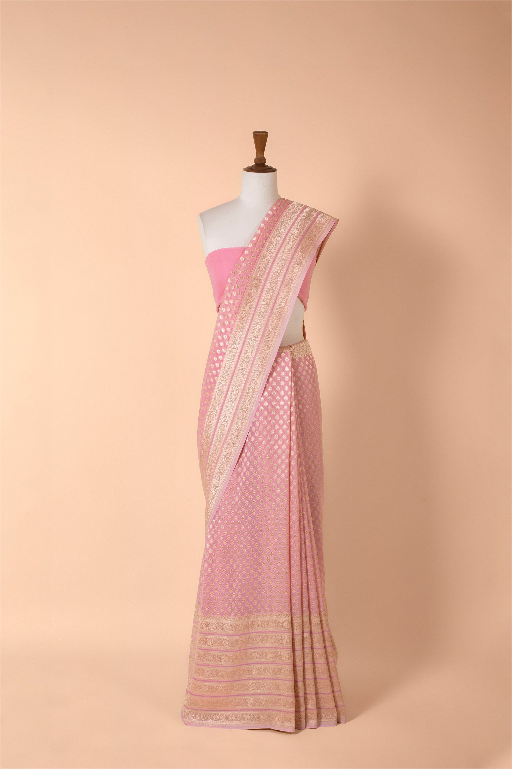 This handwoven pink georgette sari is a must-have piece for the wardrobe. Perfect for summer, meticulously handwoven with banarasi cutwork technique, it is a fine pick for festivals. It comes with an unstitched blouse.