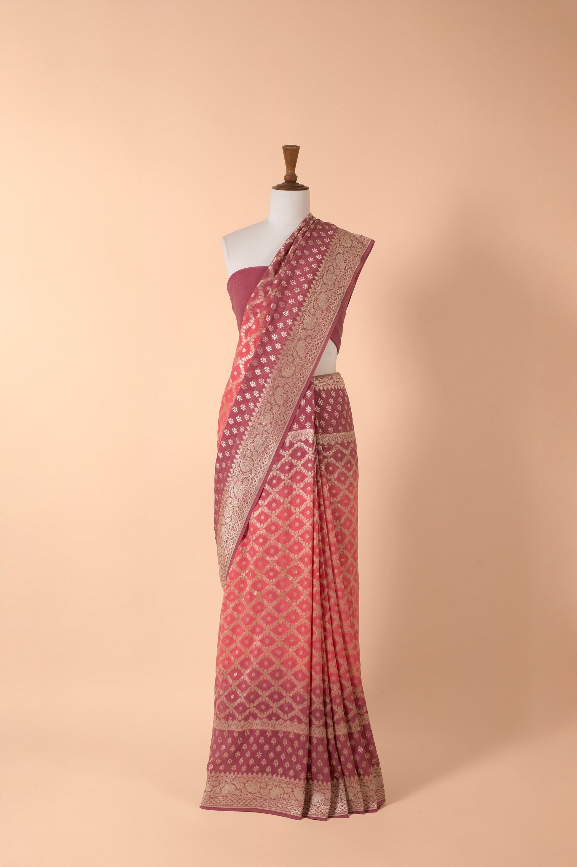 Our Handwoven Pink Georgette Sari is a product of timeless craftsmanship. The fine banarasi cutwork makes it a statement piece perfect for festivals. It comes with an unstitched blouse.
