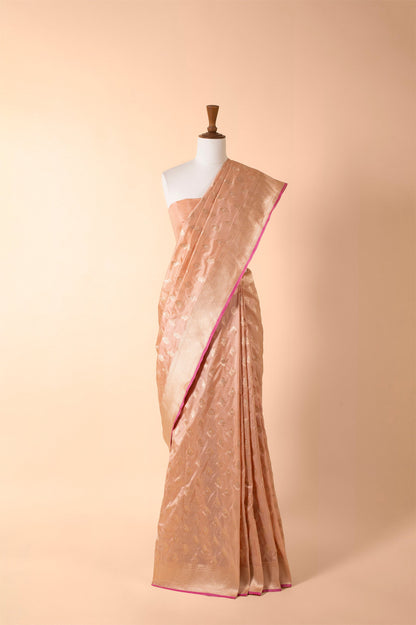 Our Handwoven Pink Silk Sari is a magnificent statement piece. Handwoven in Banaras by our skilled artisans using the traditional Banarasi cutwork technique. It comes with an unstitched blouse.
