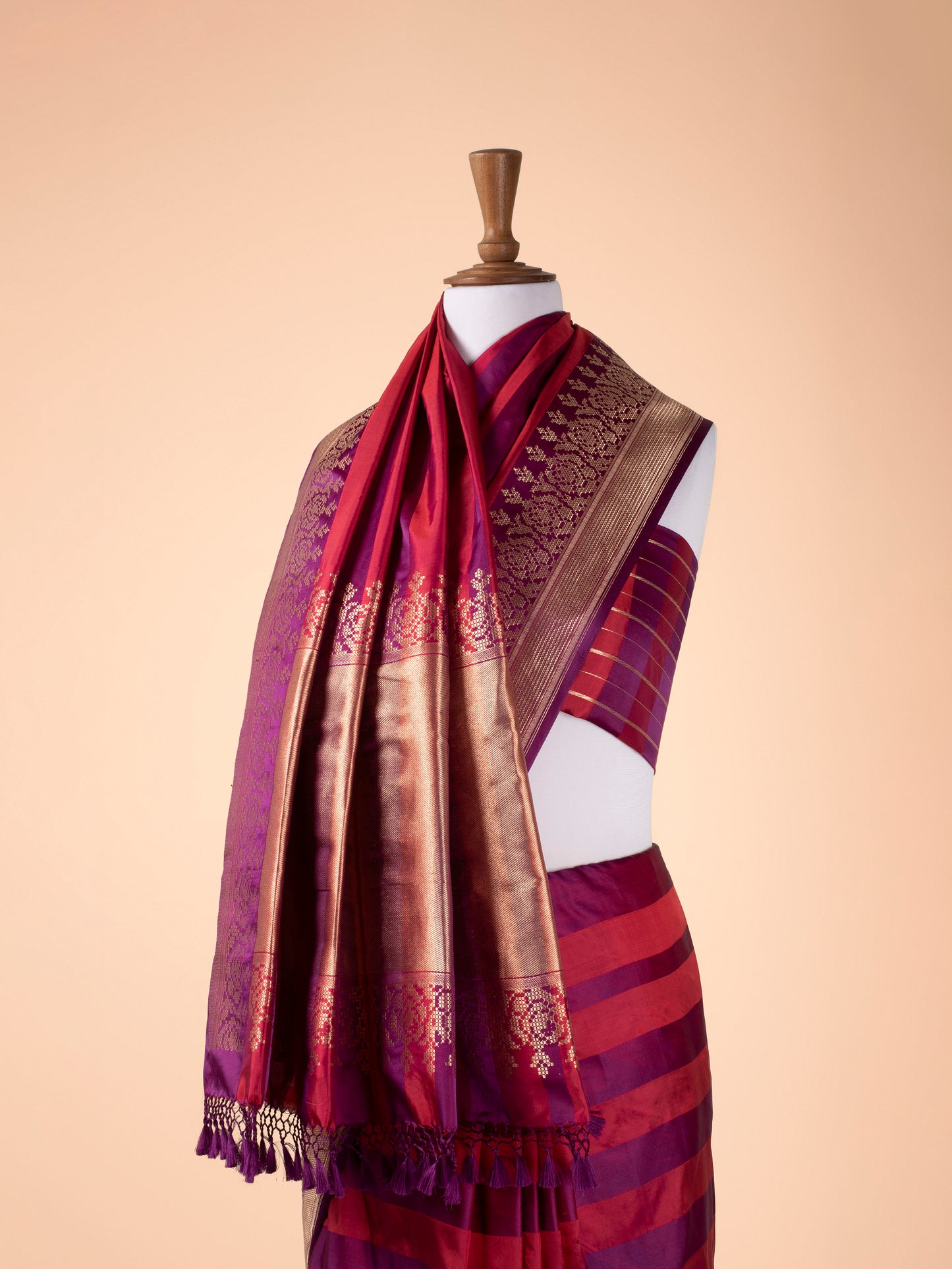 The weaving begins as the warp and weft yarns interlace under the guidance of the Jacquard cards. Thread by thread, the saree slowly takes shape—a process that can take weeks, sometimes even months.