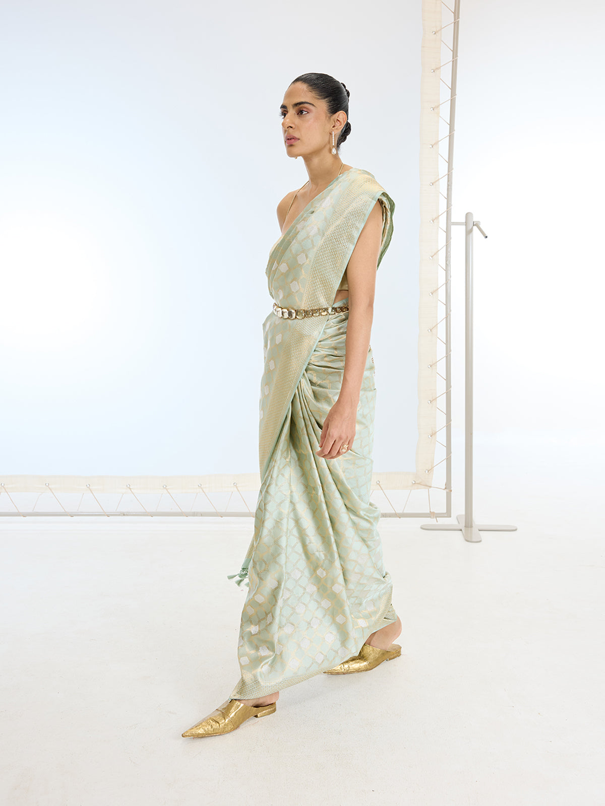 Saree pleats are neatly stitched in place for quick and easy draping.
