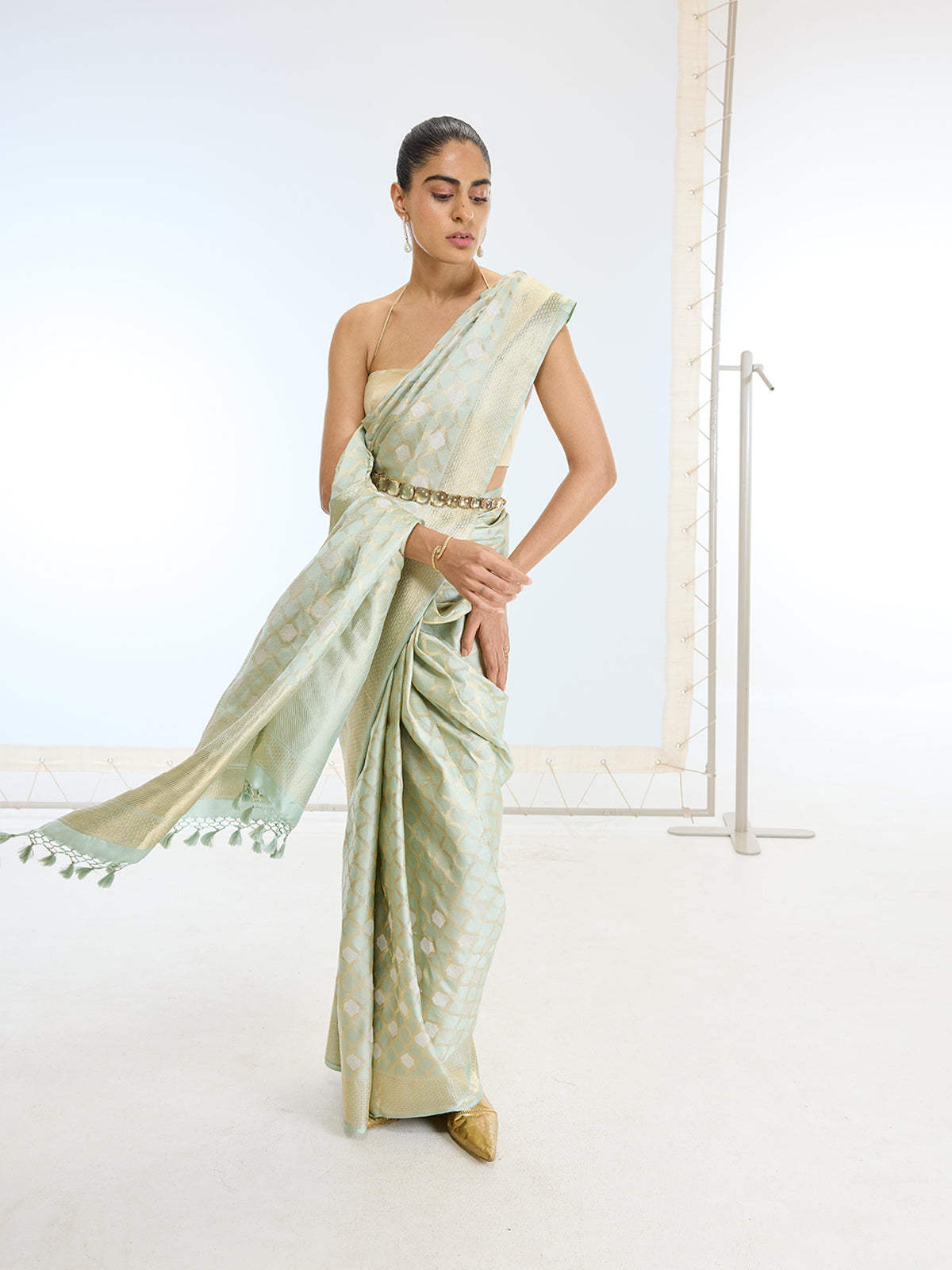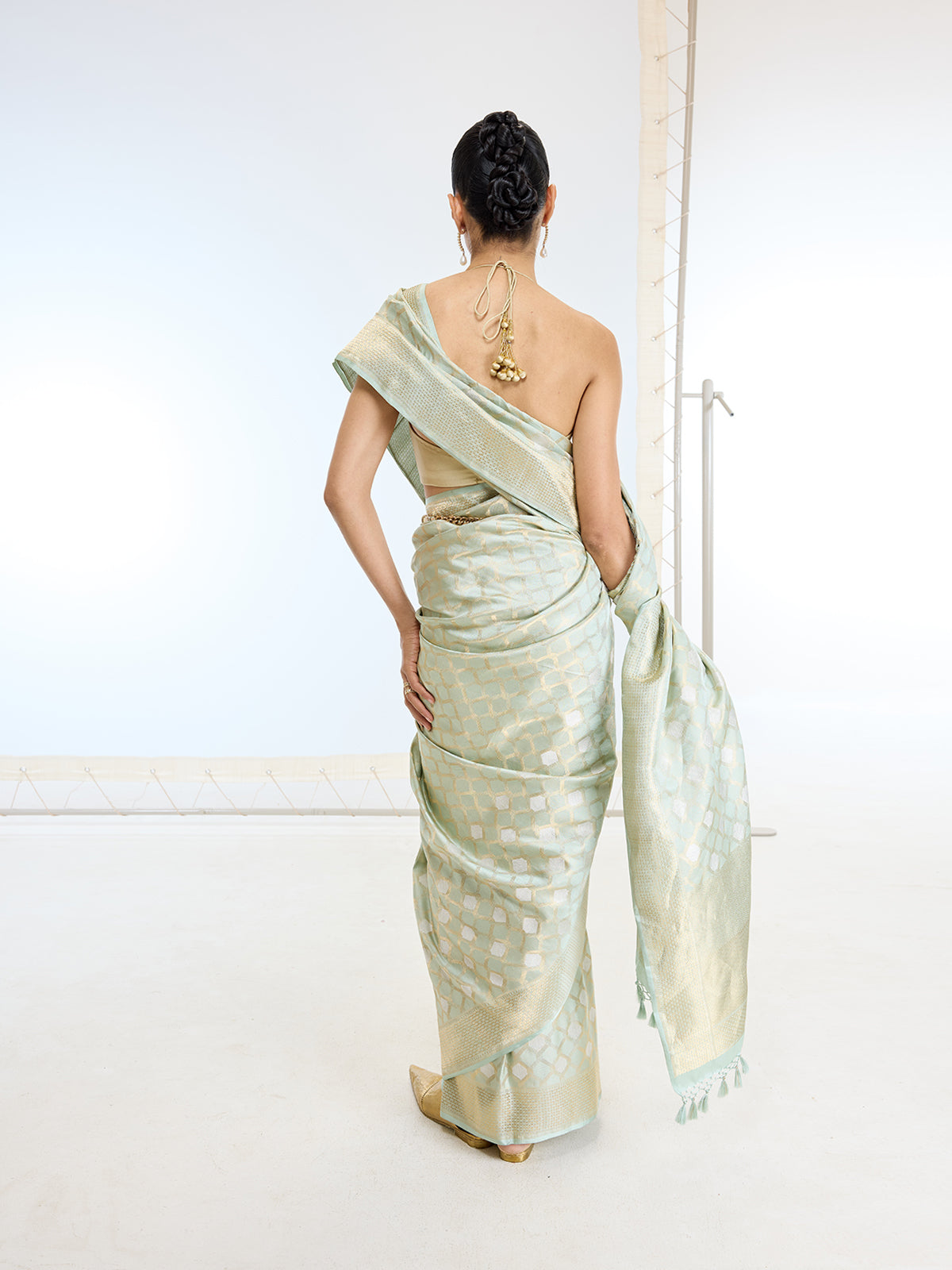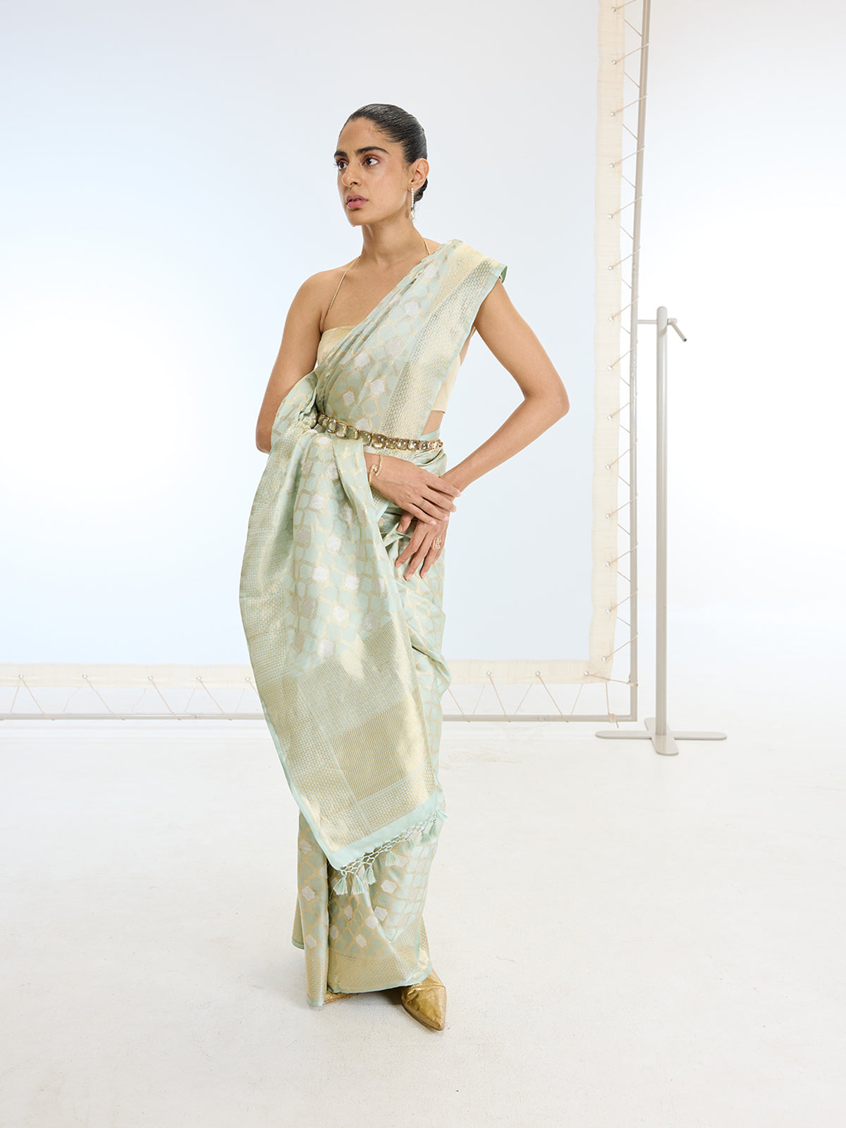 With its cool, serene hue, this turquoise silk saree brings a breath of fresh air to timeless Banarasi craftsmanship. Handwoven using the intricate Kadwa Banarasi technique, it pairs delicate detailing with a lightweight, fluid drape—perfect for breezy summer evenings and sunlit gatherings.