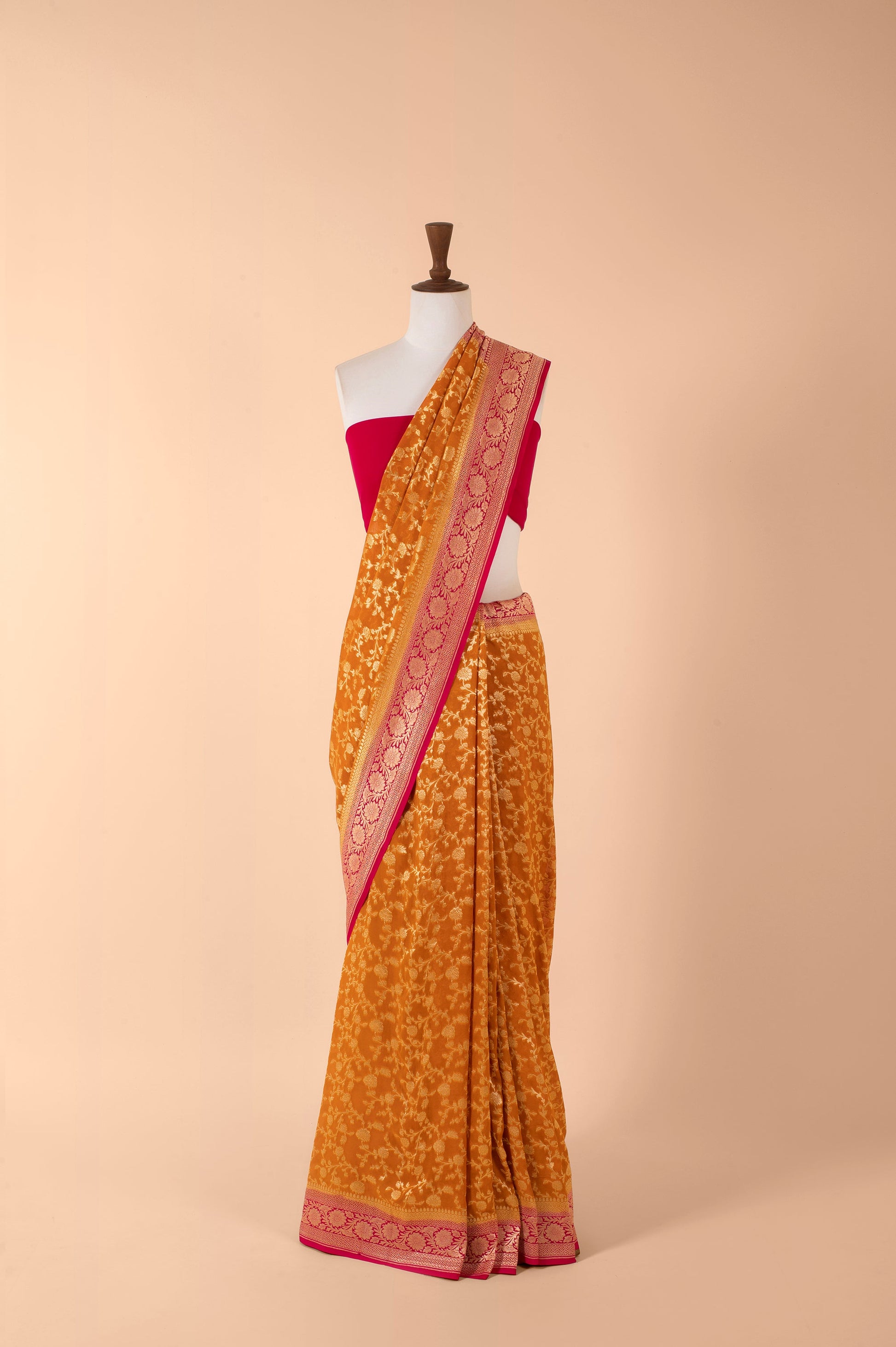 Our handwoven orange georgette sari features design hand done by our weavers through banarasi cutwork technique. It comes with an unstitched blouse fabric.