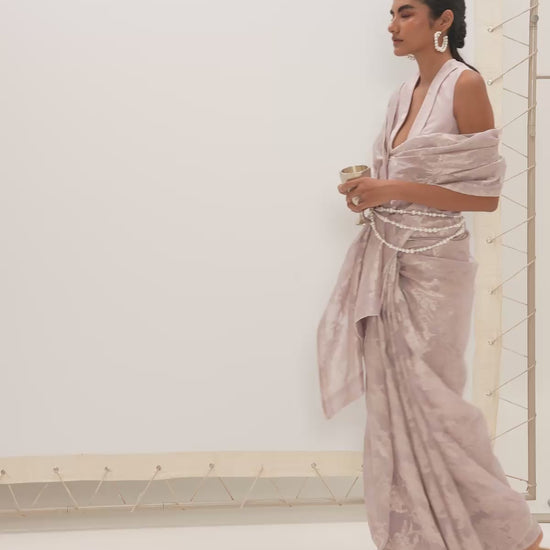 The Diana Saree in a delicate mauve is handwoven in pure organza silk using the silver floral jaal technique. Lightweight and fluid, this drapes beautifully and feels soft on the skin.