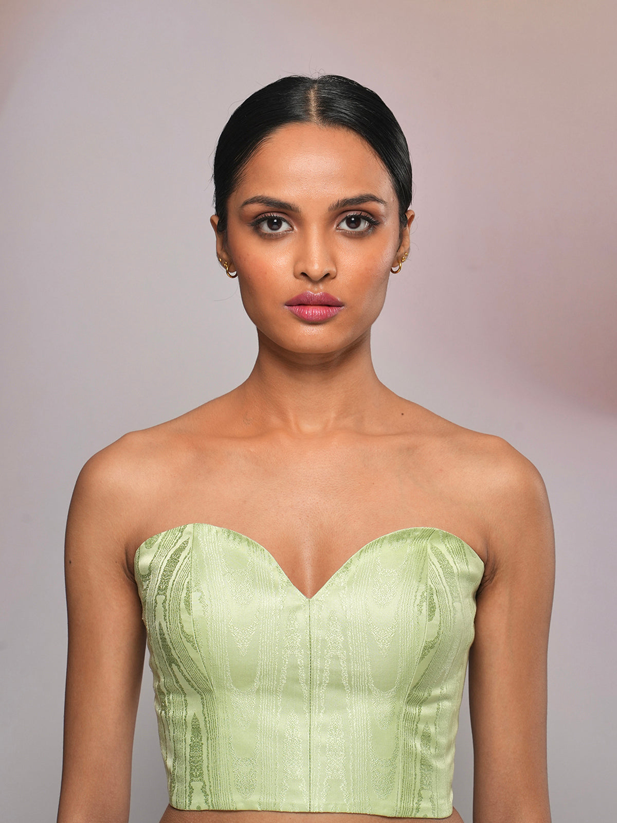 Handwoven in tanchoi silk using the Kadwa Banarasi technique, our pista green corset-style blouse comes with a sweetheart neckline and can be easily paired with our range of Banarasi sarees. You can also mix, match and style it with pantsuits.