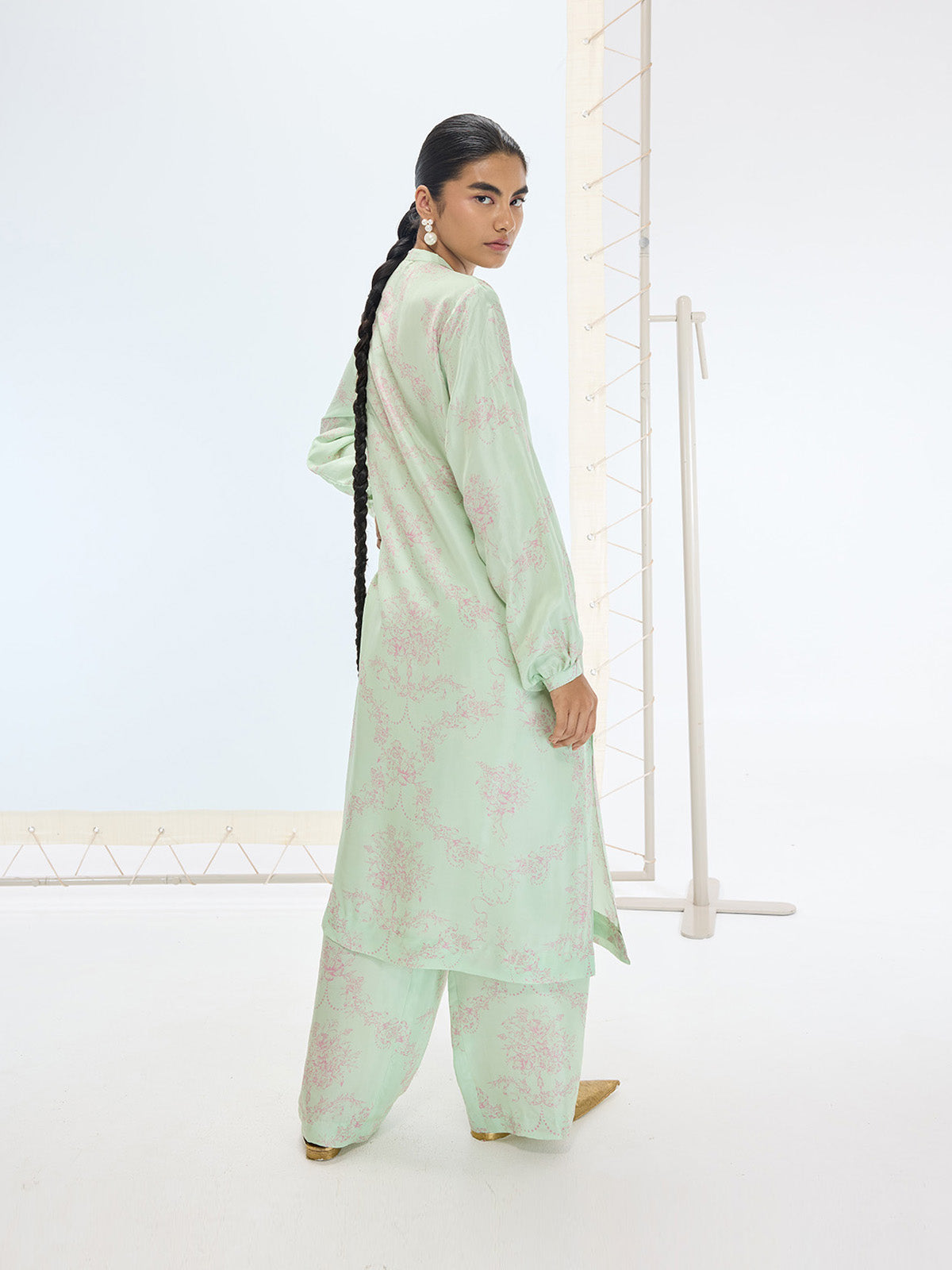 The Sophie Kurta Set in refreshing sea green is handwoven in soft, luxurious Habutai silk, featuring an all-over printed pattern that adds subtle elegance. Lightweight and fluid, this versatile set transitions effortlessly from day to night—making it the perfect choice for warm summer days when ease and sophistication go hand in hand.